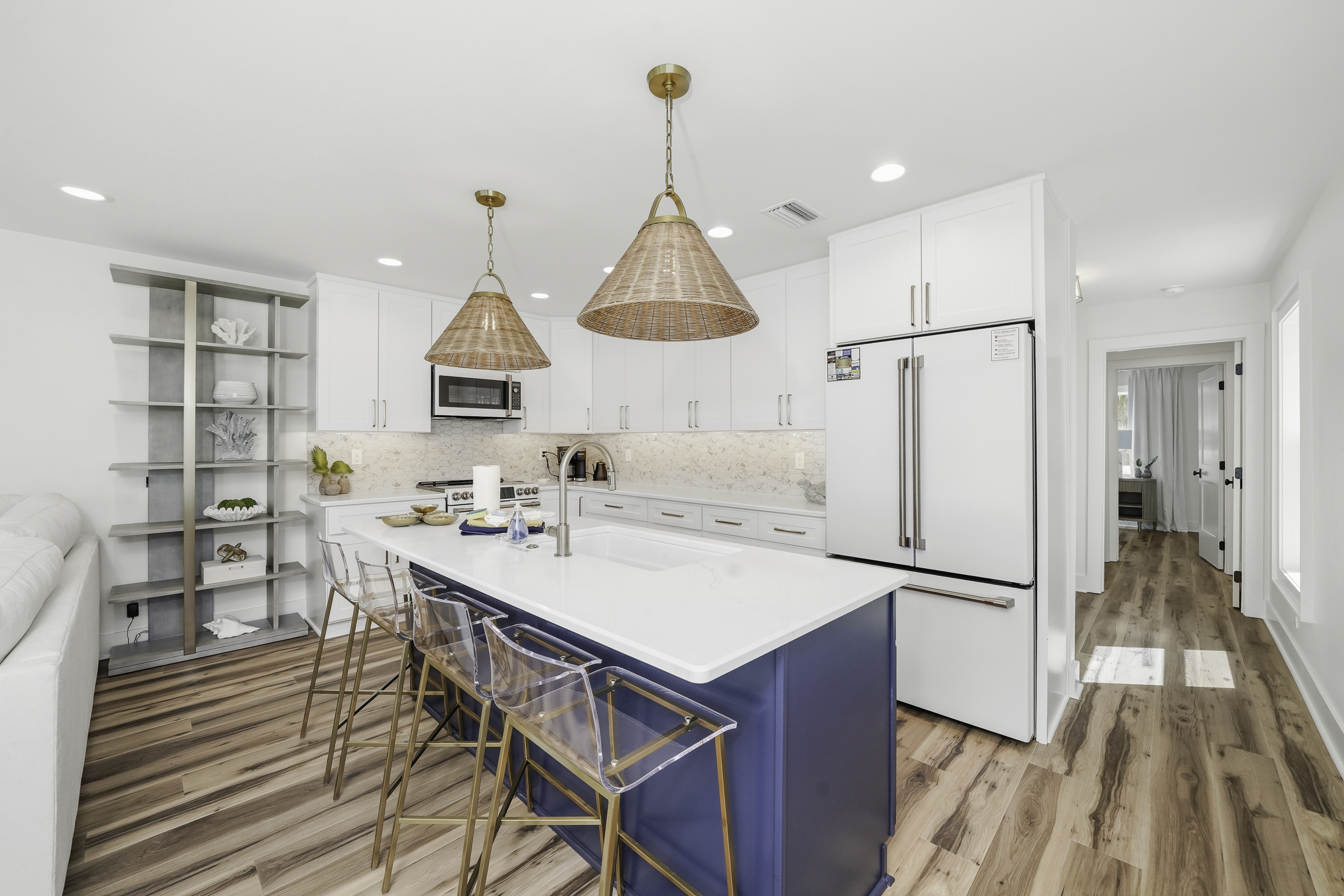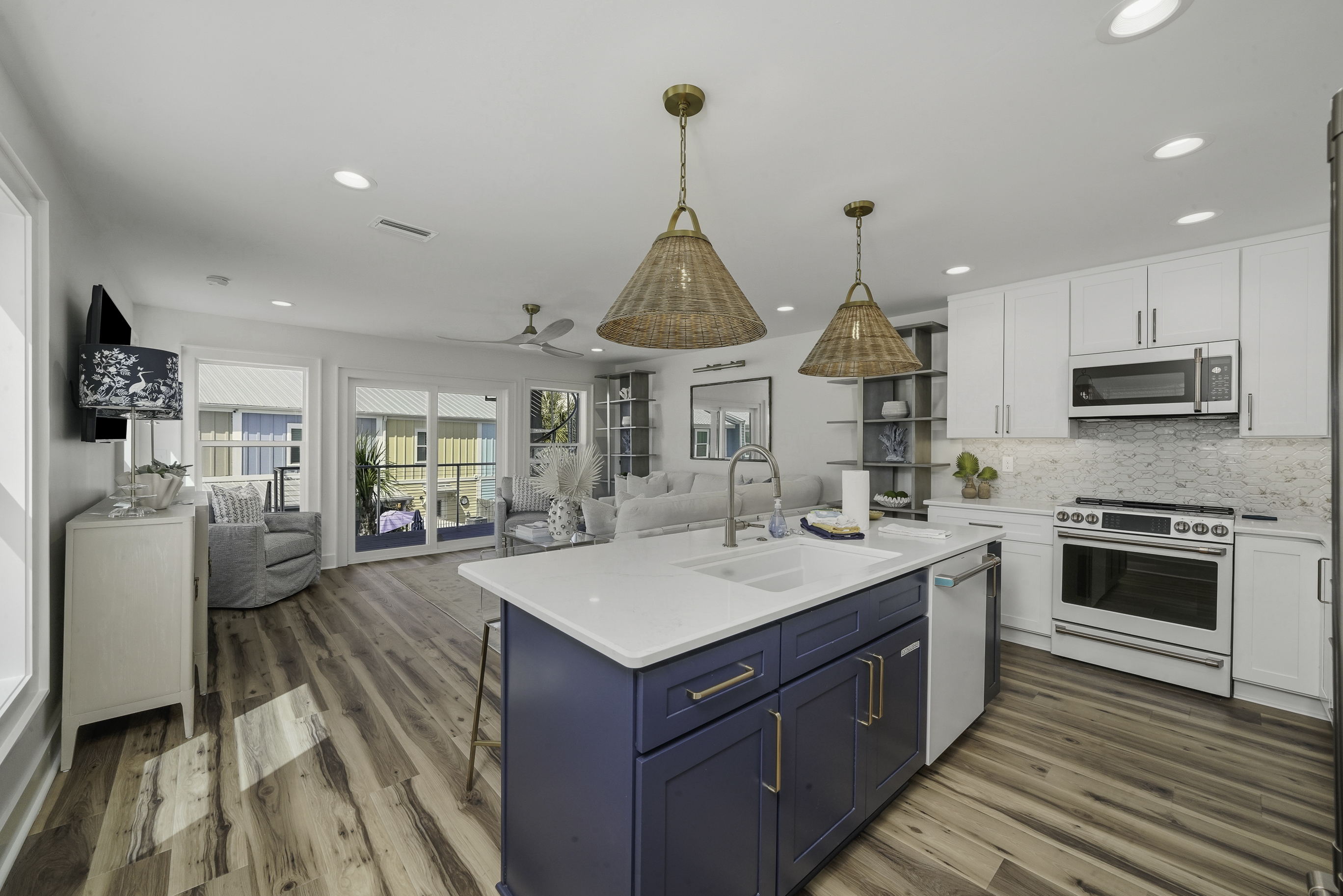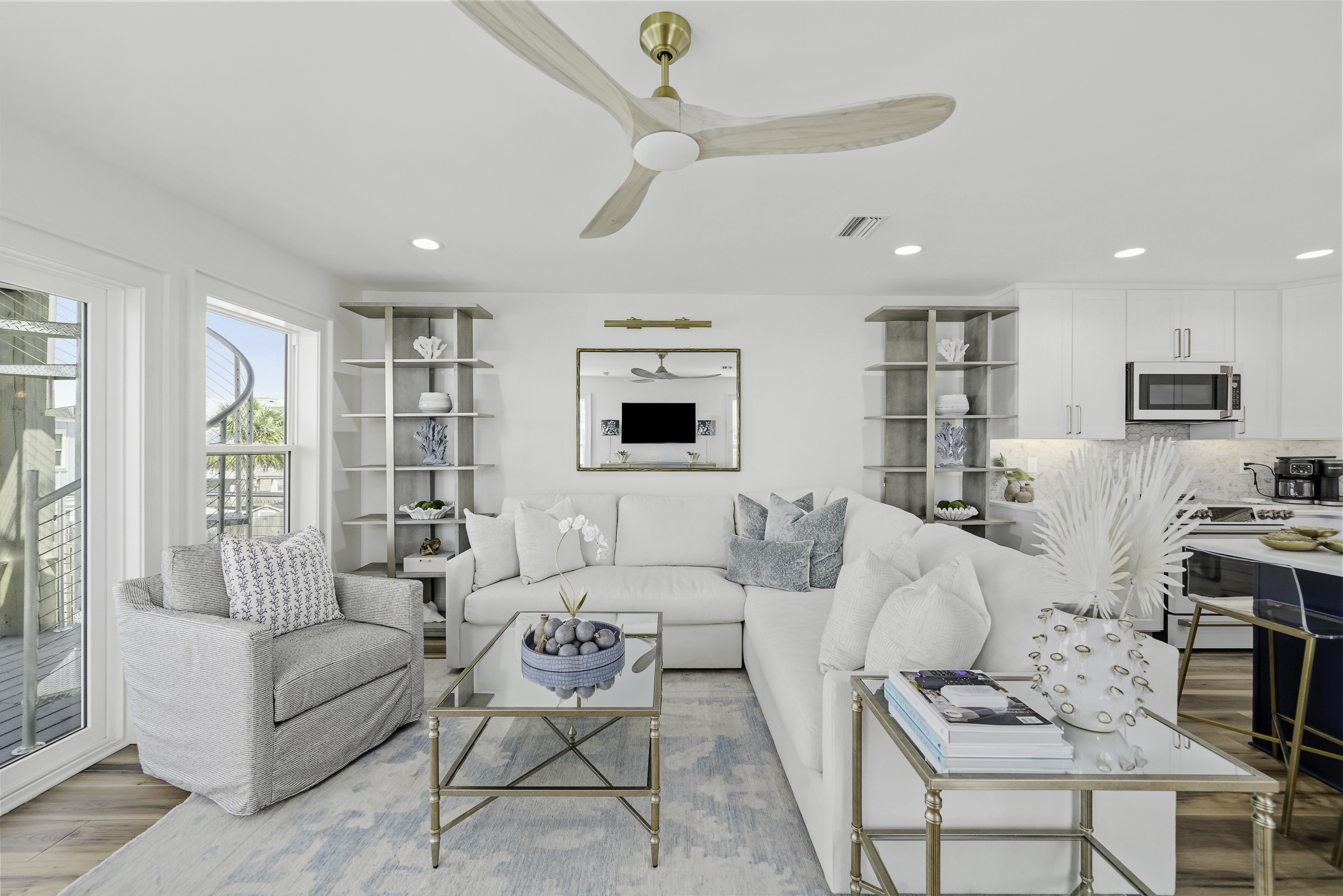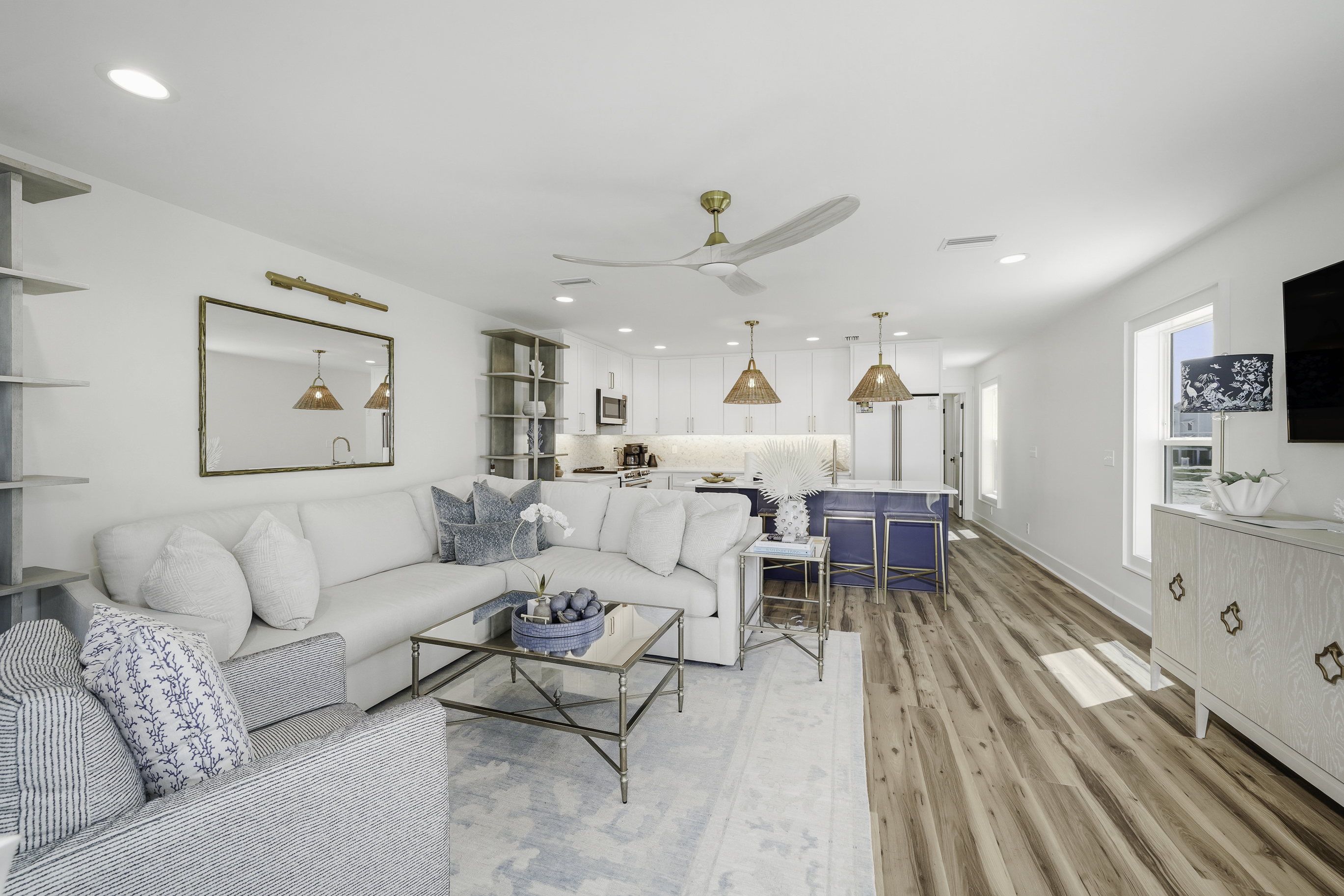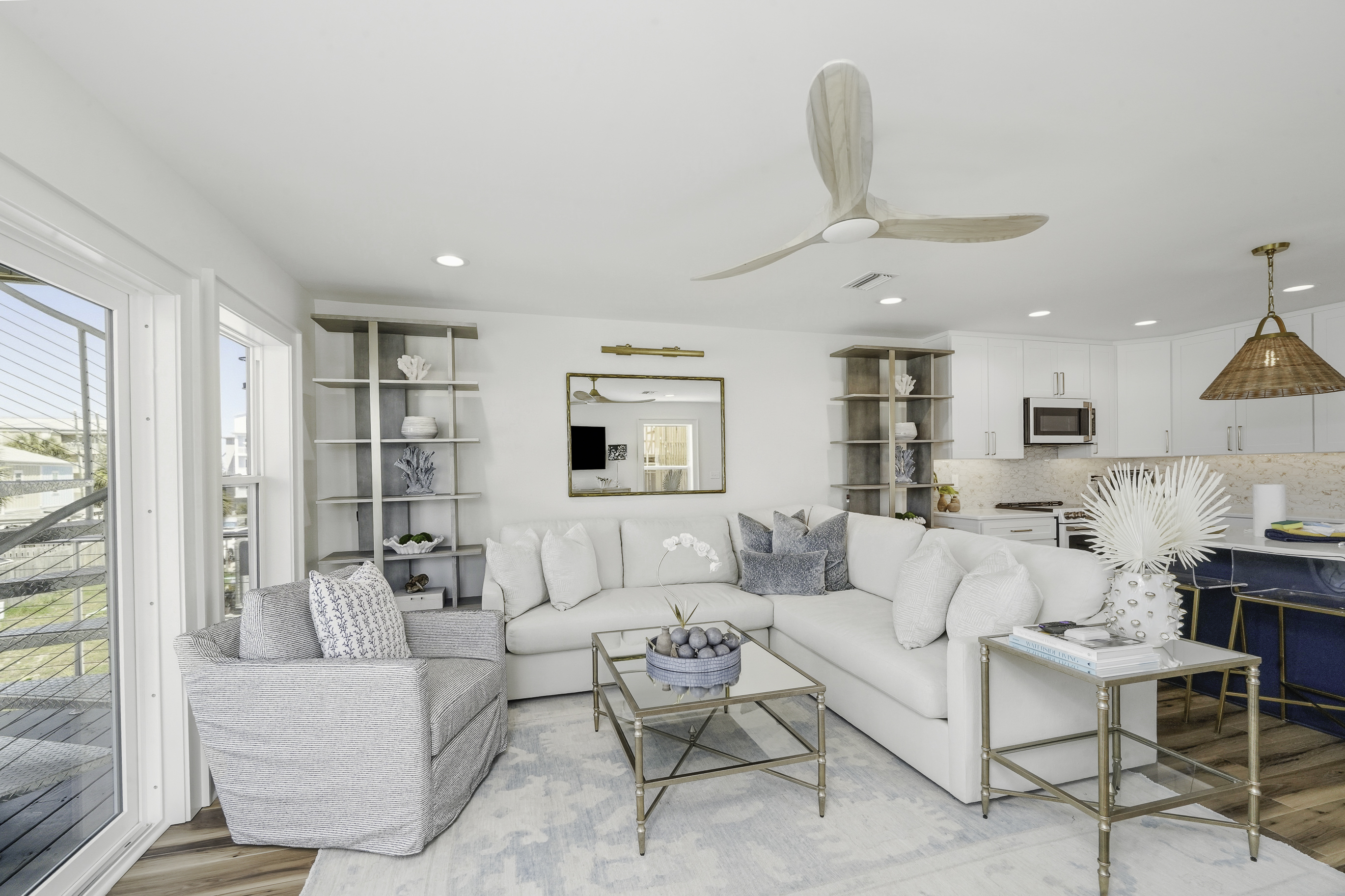 Thoughtfully decorated with a fresh coastal aesthetic, the home welcomes you with an inviting main living area filled with natural light. The living room features a large sectional and smart TV with high-speed internet, creating a comfortable place to unwind after a day spent enjoying the beach.