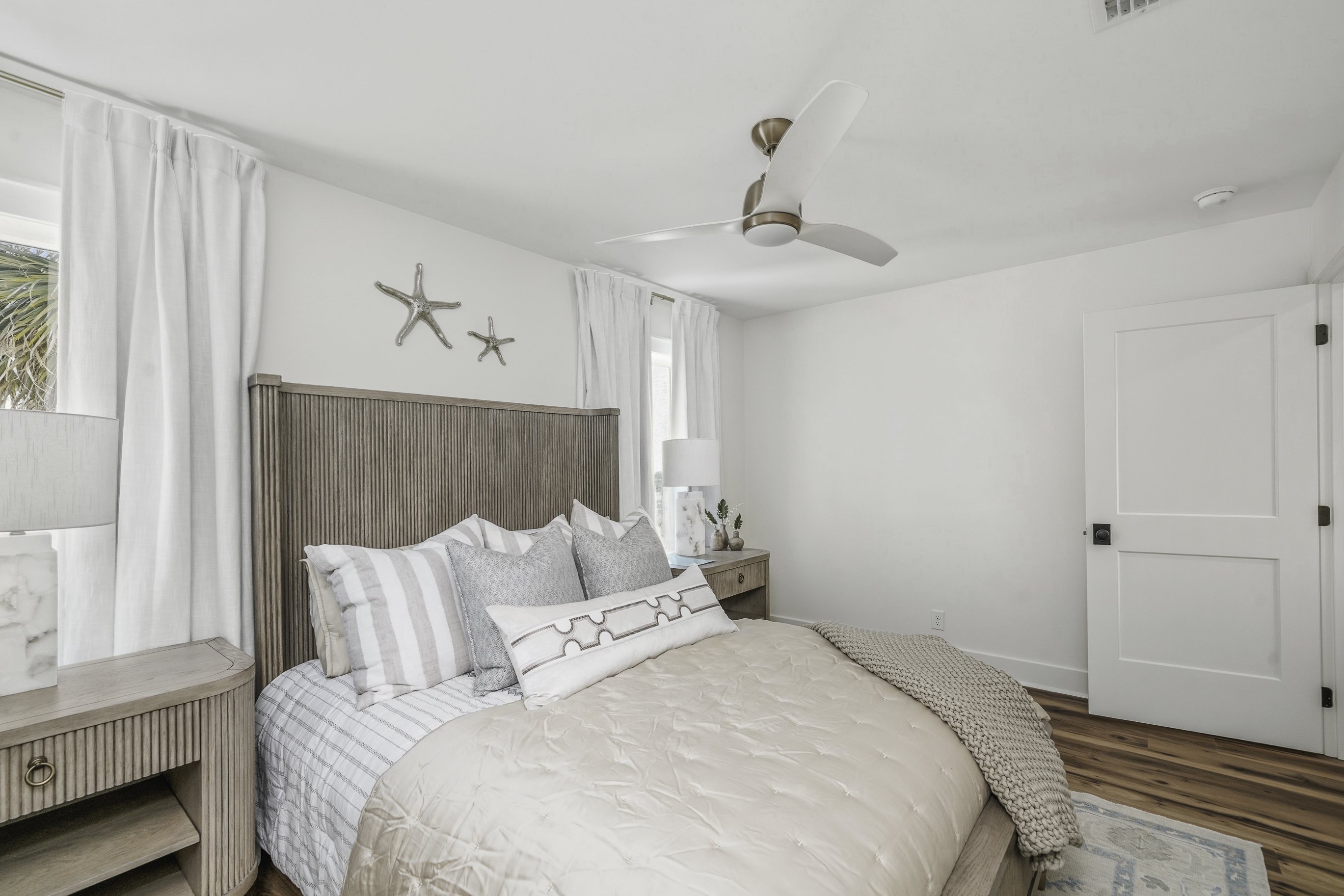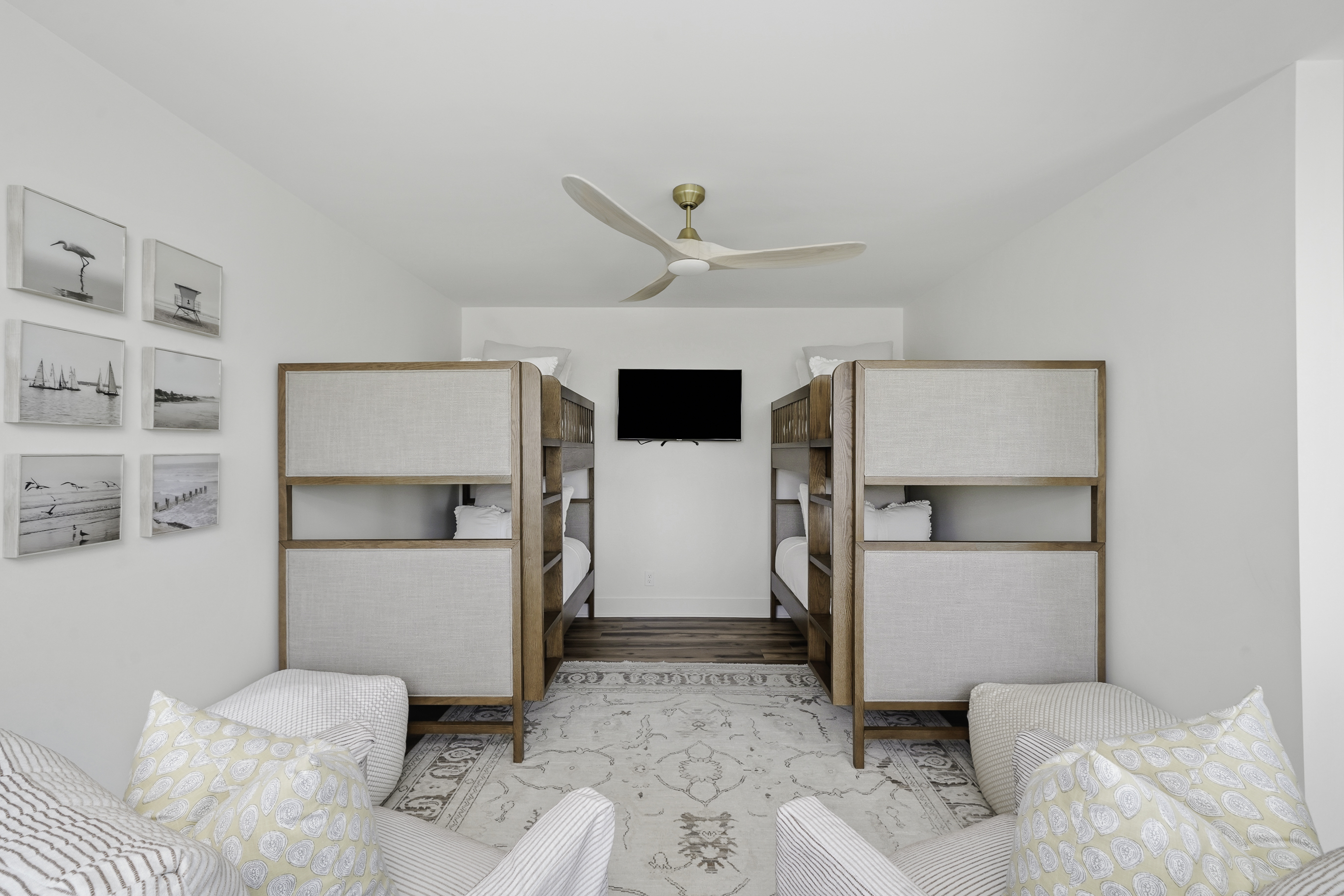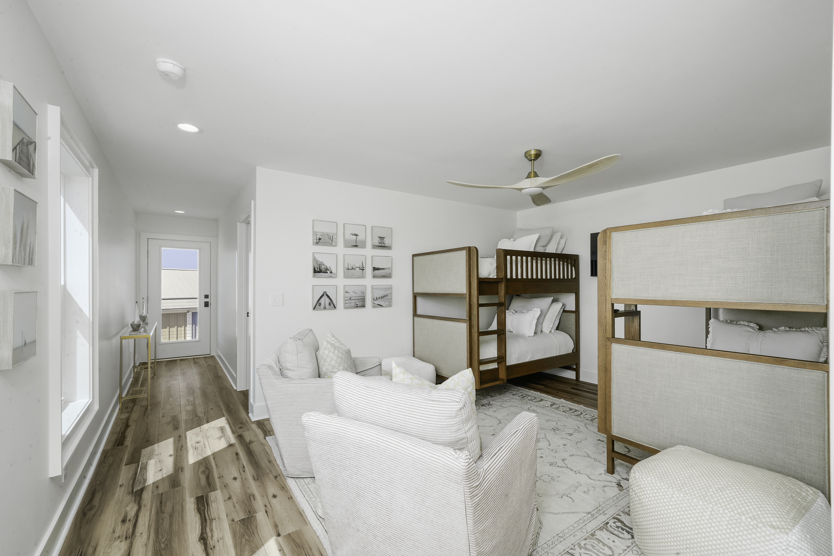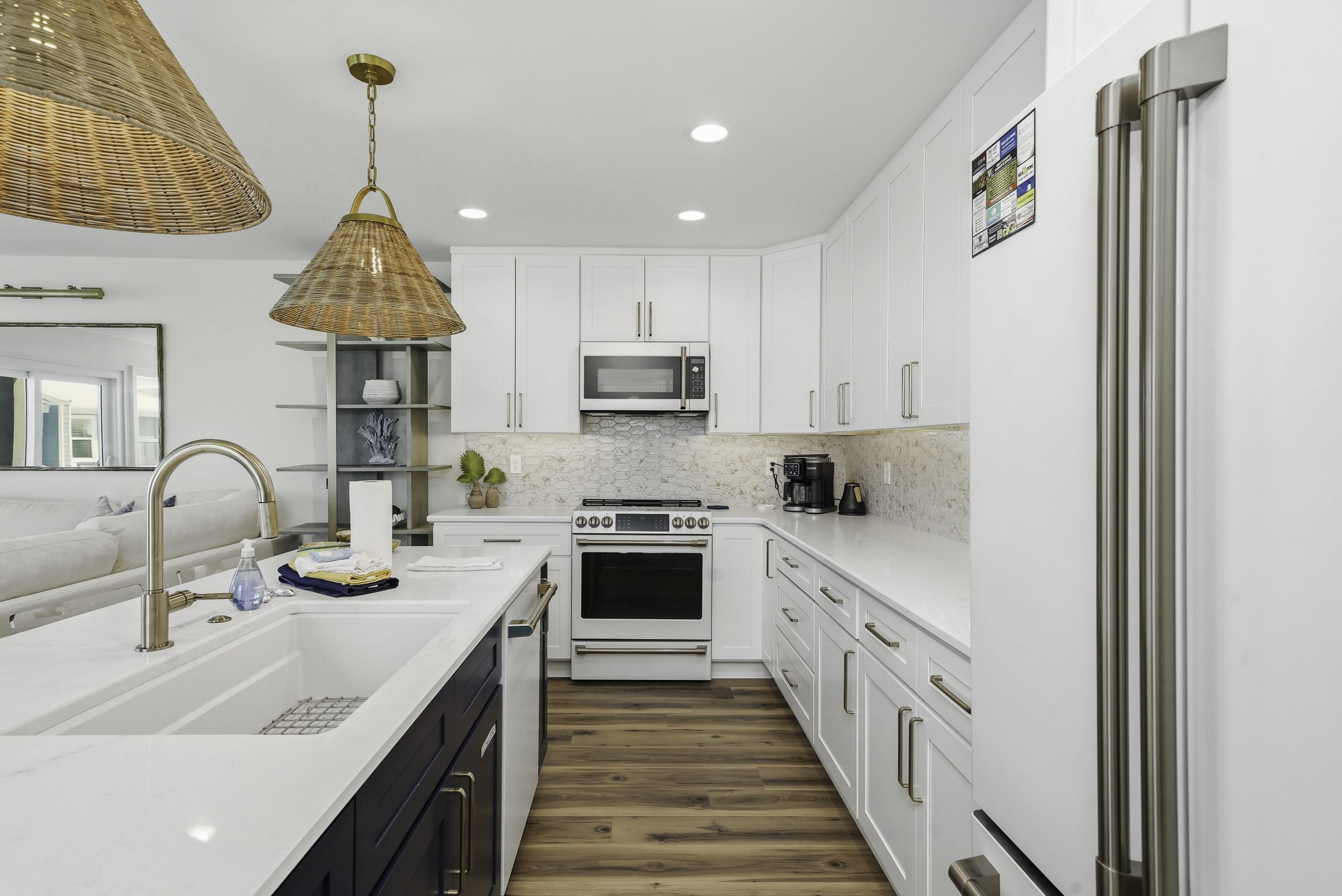 Thoughtfully decorated with a fresh coastal aesthetic, the home welcomes you with an inviting main living area filled with natural light. The living room features a large sectional and smart TV with high-speed internet, creating a comfortable place to unwind after a day spent enjoying the beach.