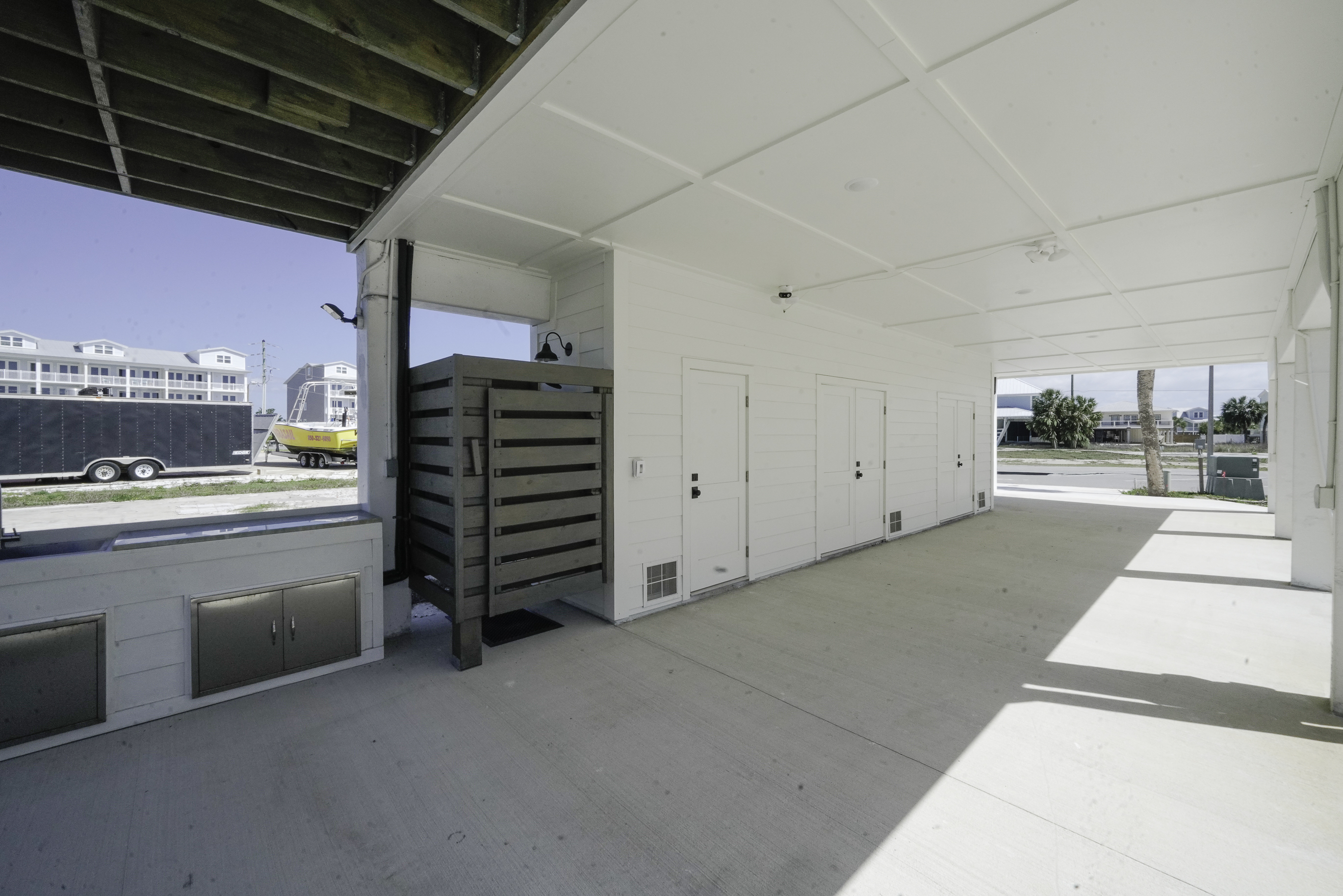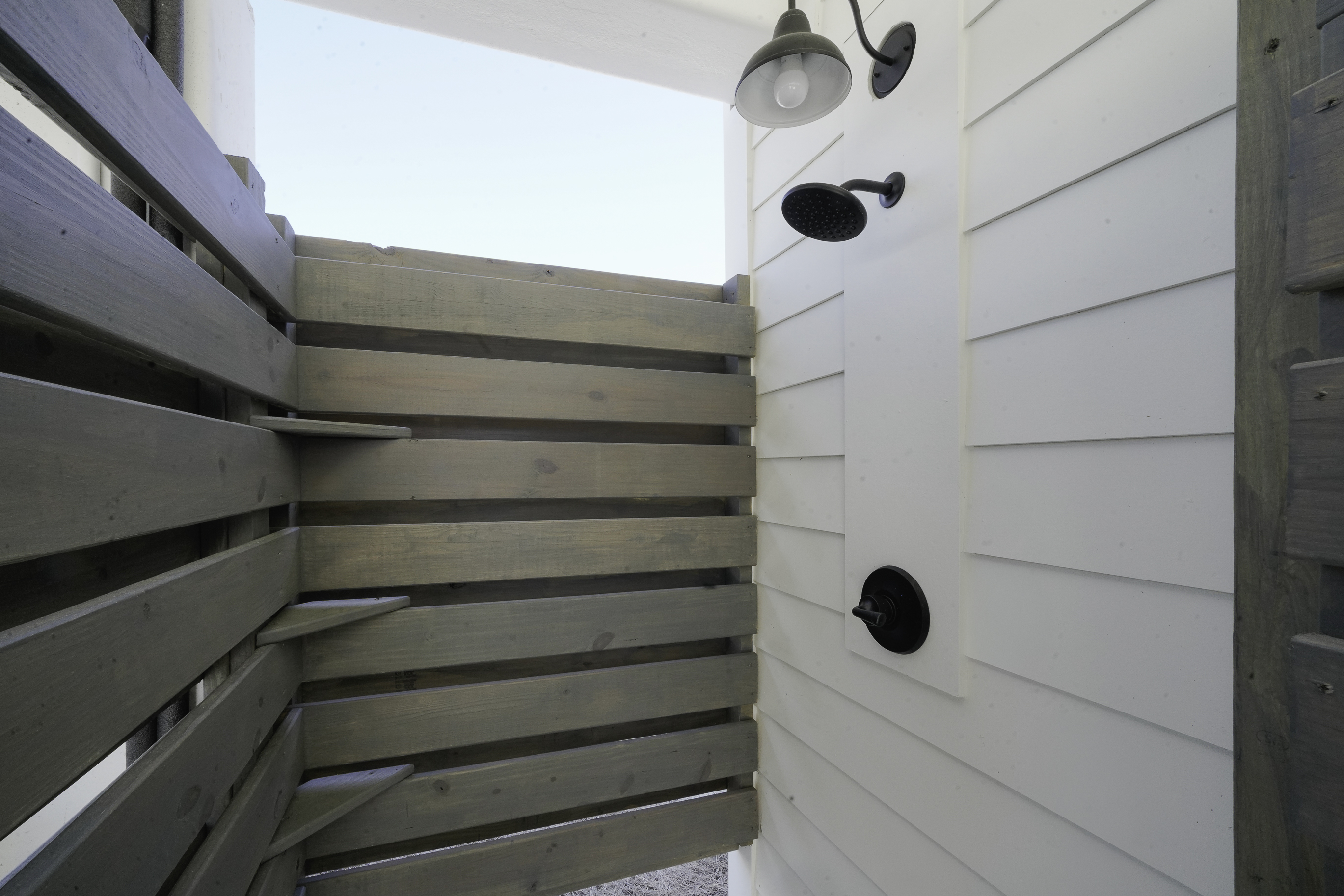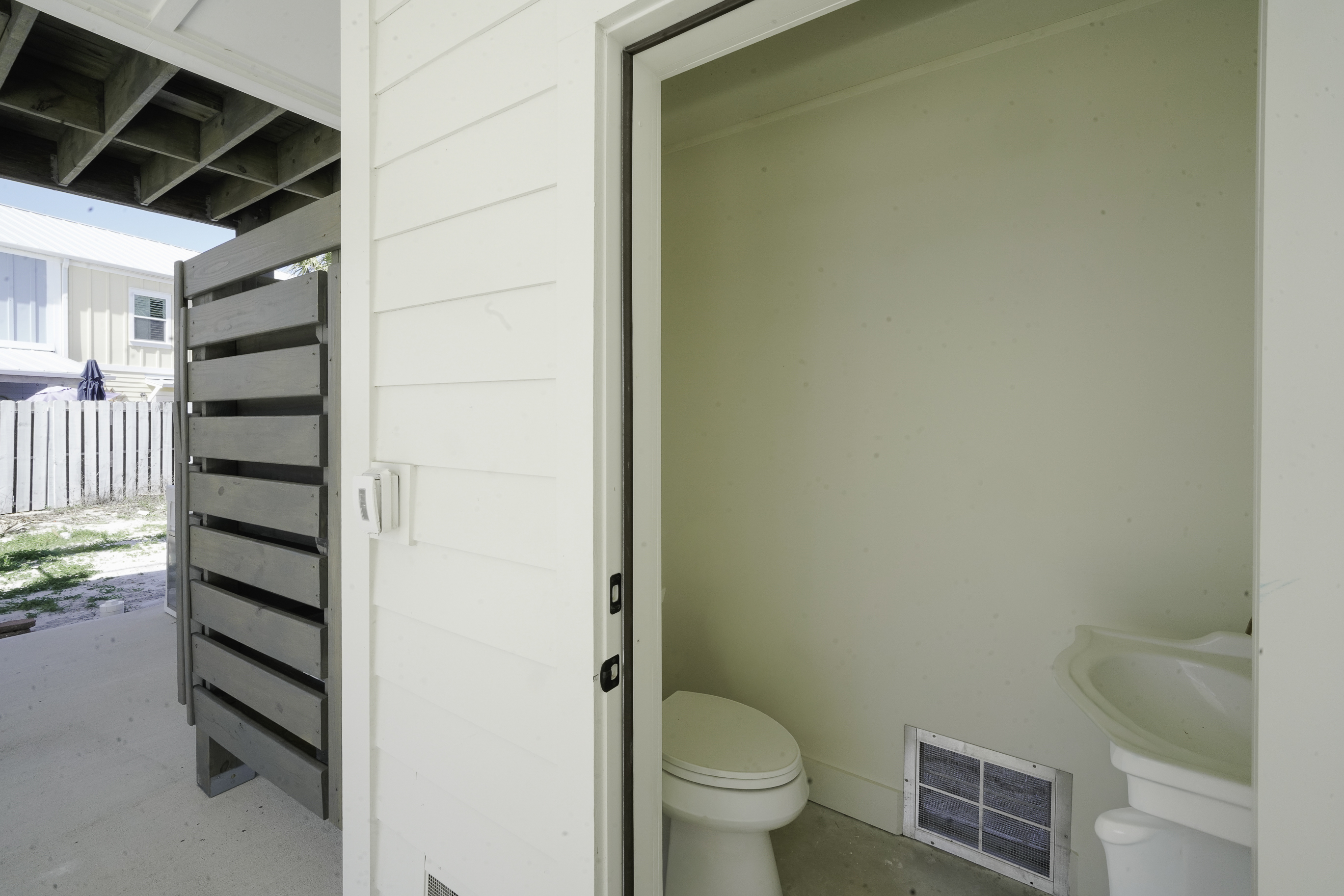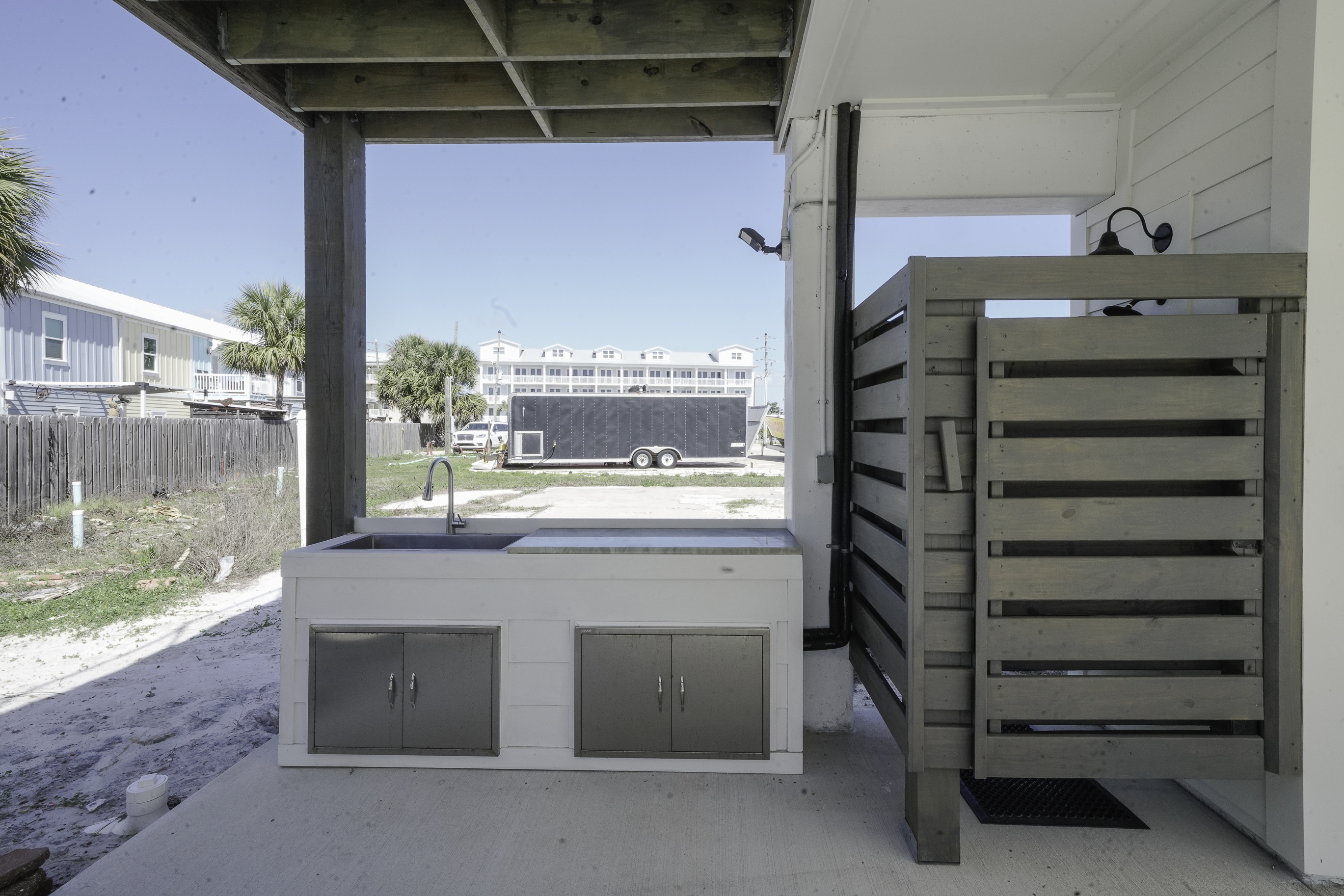 Built on pilings in classic coastal style, the home offers convenient covered parking beneath the house along with several outdoor features designed for beach living. Guests will appreciate the fish cleaning station for fresh catches, a hot and cold outdoor shower for rinsing off after the beach, and a convenient half bathroom located on the ground level.