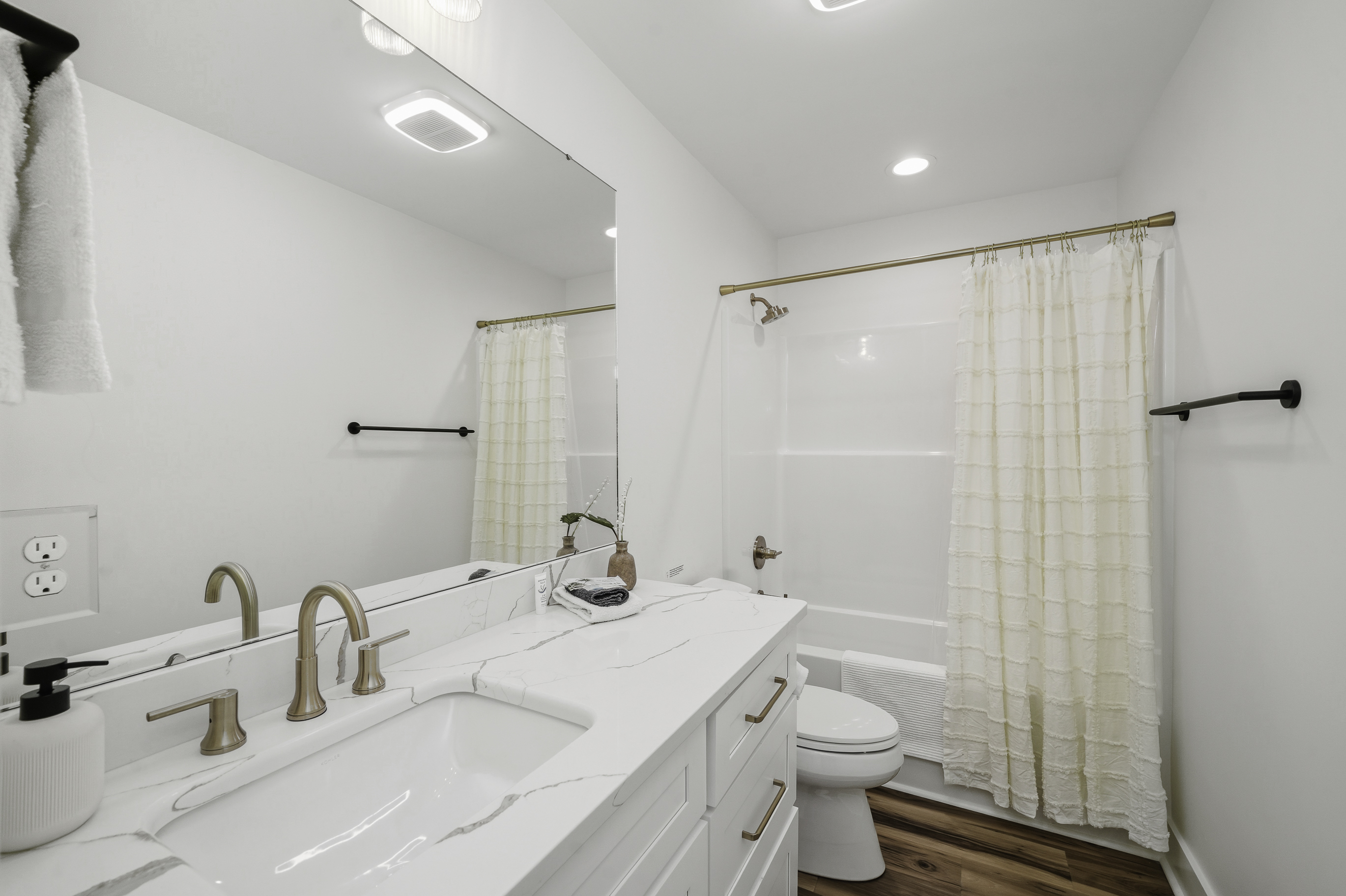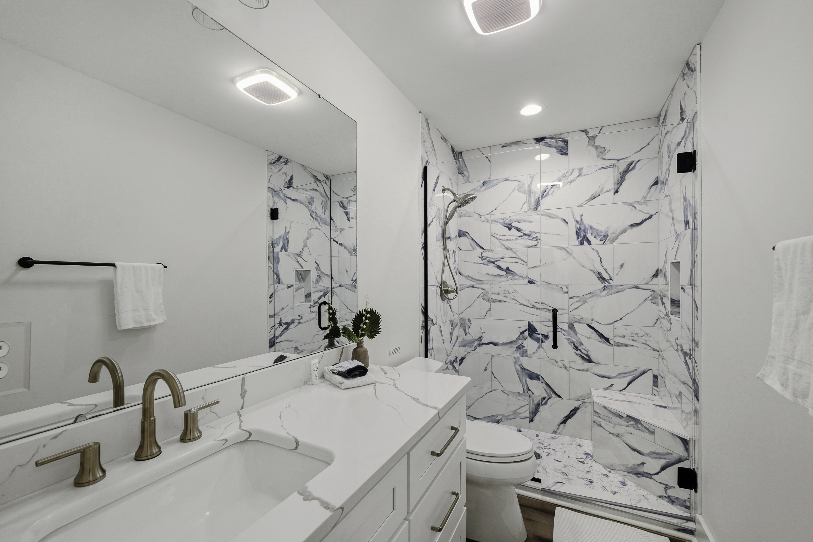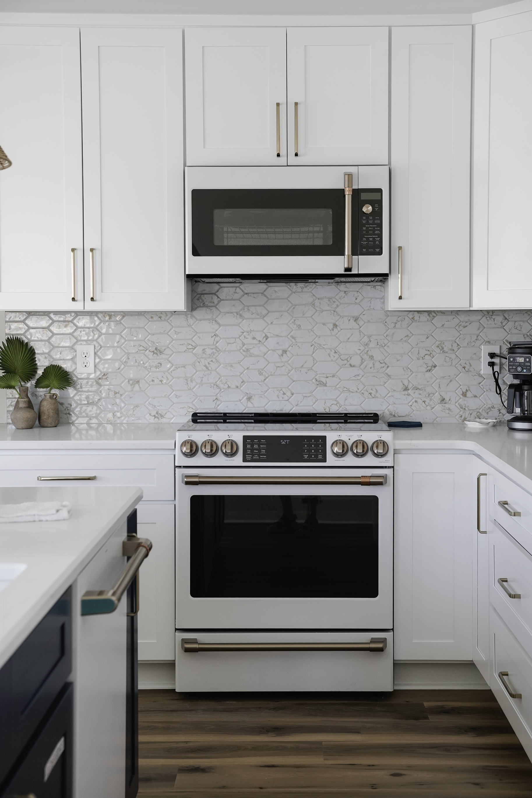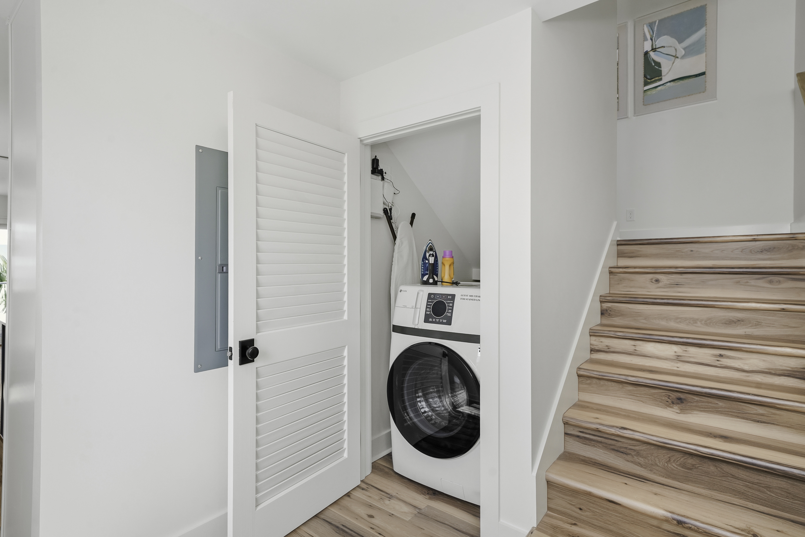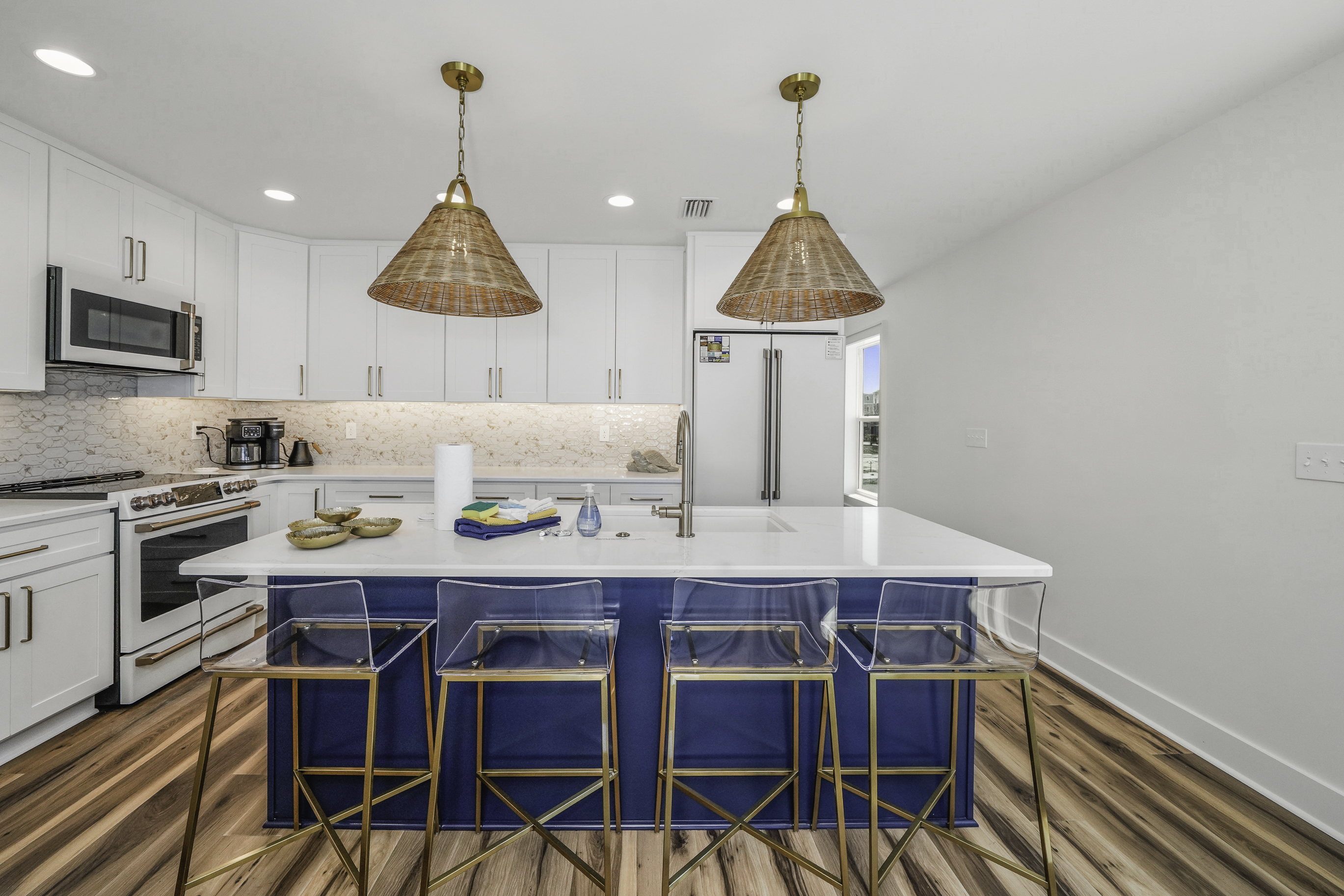 The modern kitchen is both stylish and functional, featuring luxury Café appliances, gorgeous stone countertops, custom cabinetry, and all the cookware and essentials needed for preparing meals at home. The open layout allows the kitchen, dining, and living areas to flow seamlessly together, making it easy to gather, cook, and connect.