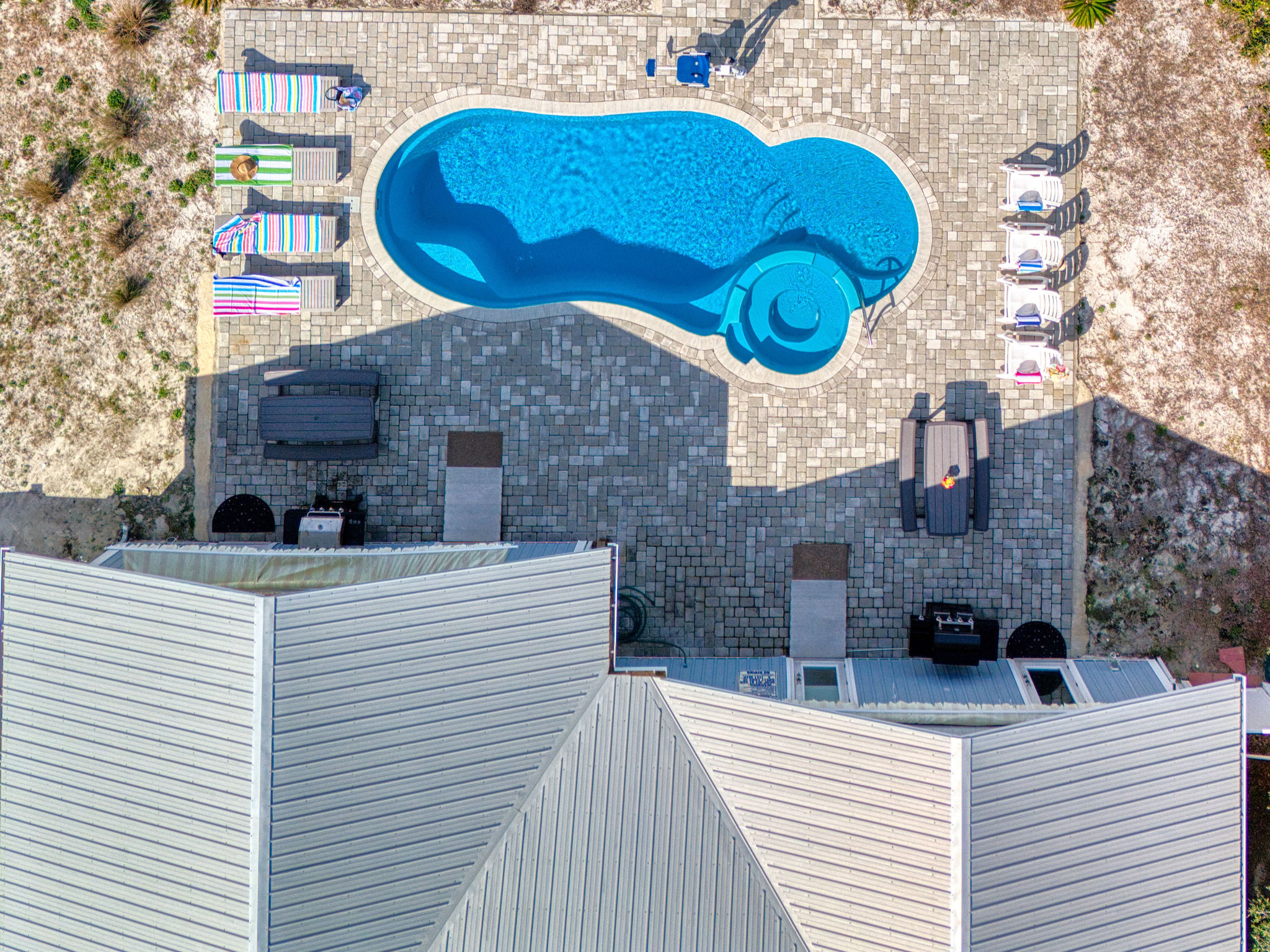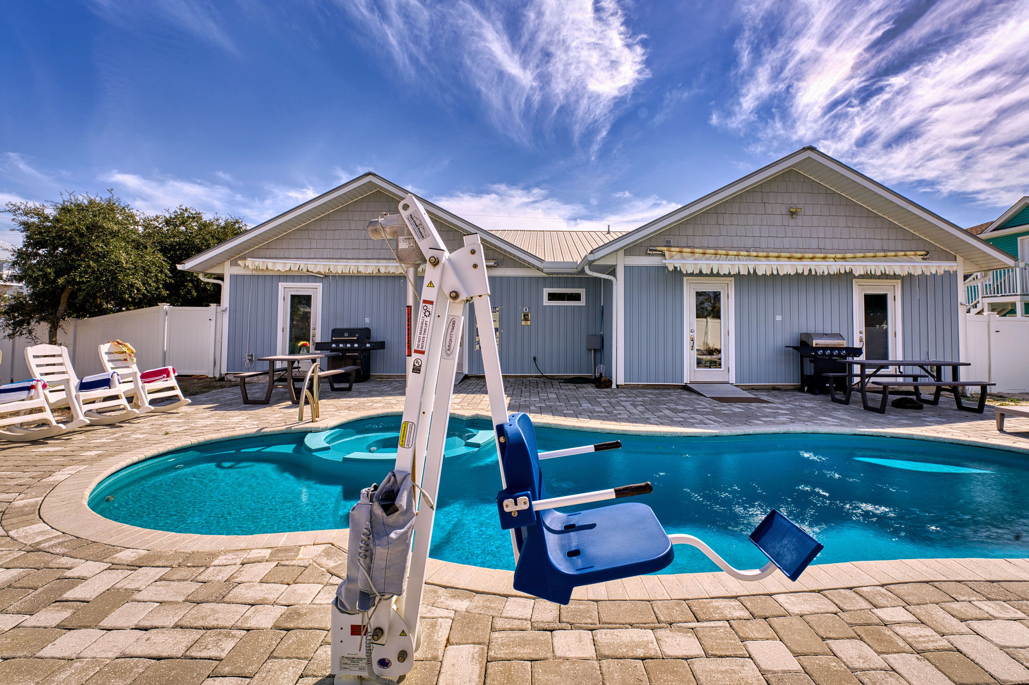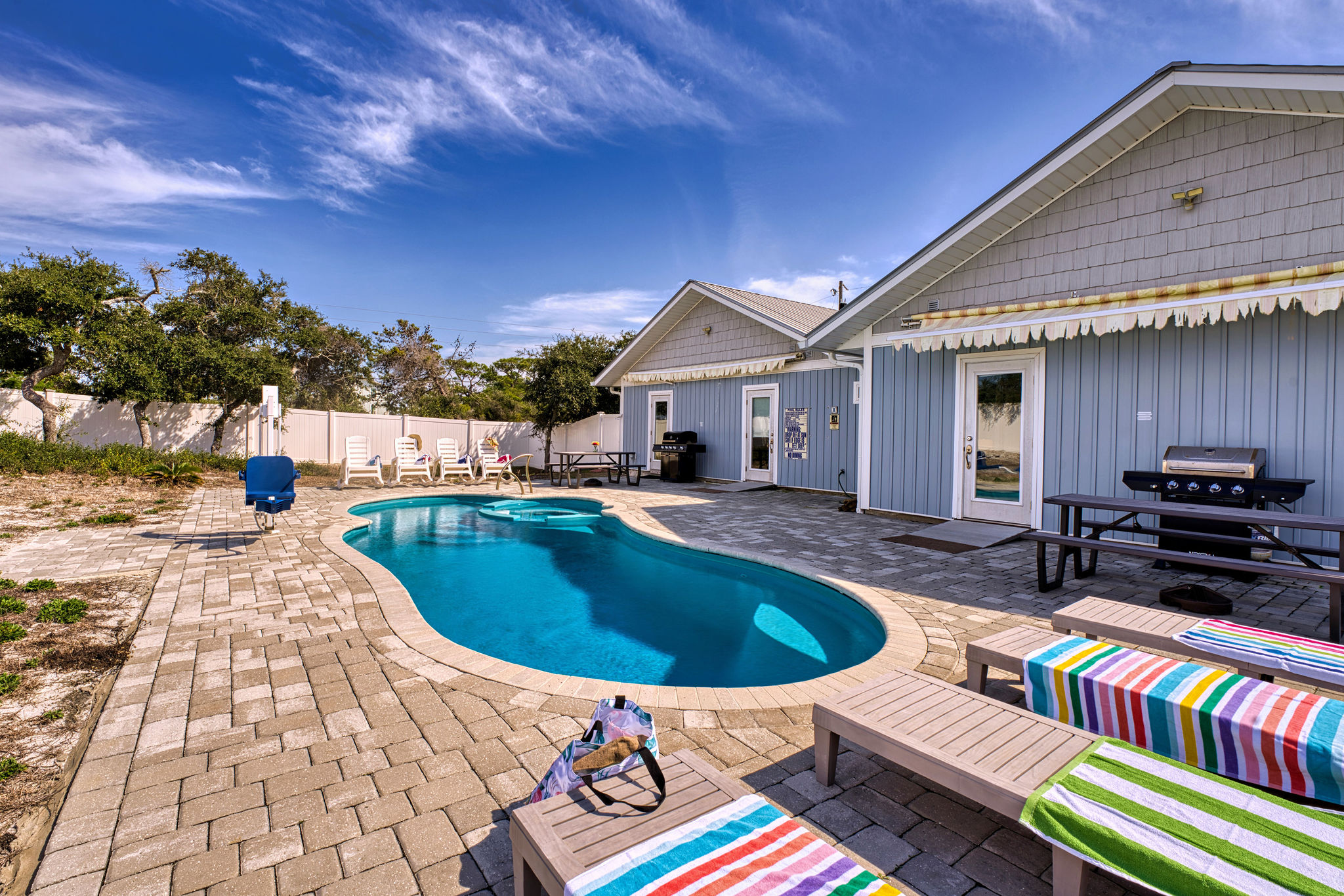 The backyard is your private paradise, featuring a sparkling pool, spa, grill, and a privacy fence for tranquil seclusion. Savor outdoor dining or sunbathe by a shared pool. The property is equipped with games, beach gear, and amenities for maximum comfort and fun.