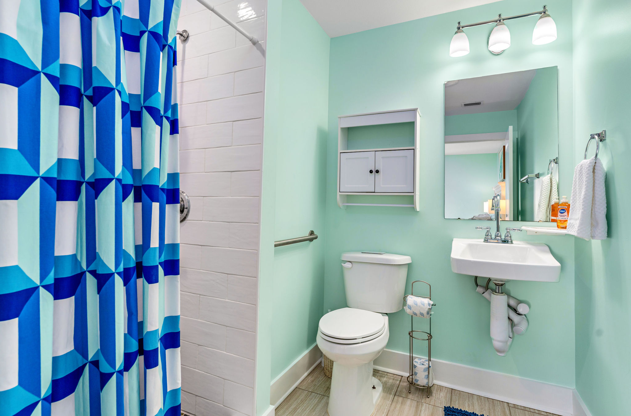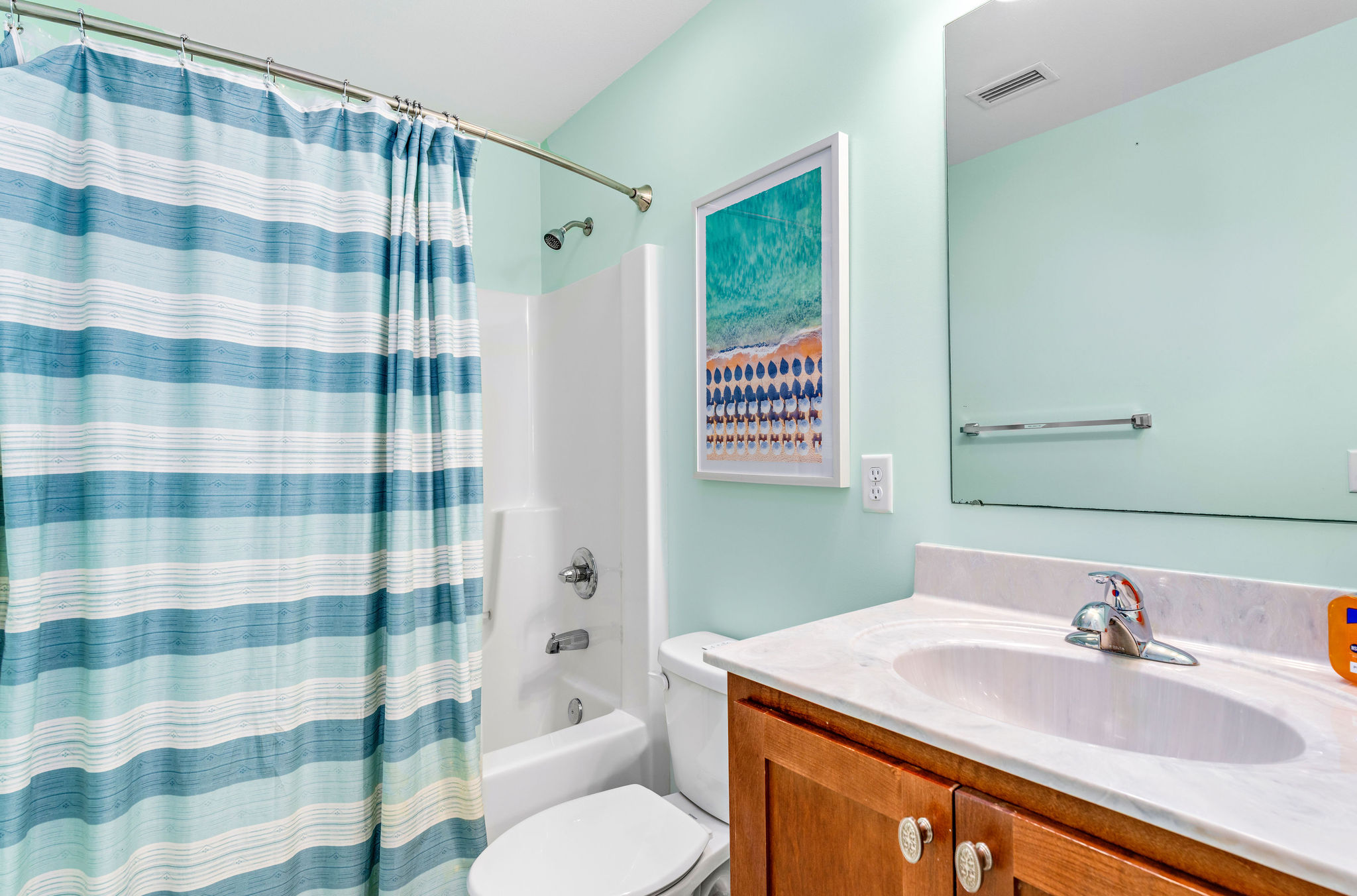 Inside, Gulf Delight exudes coastal charm with an open-concept living area, a fully equipped kitchen, and comfy new beds throughout its 3 bedrooms, comfortably accommodating up to 6 guests. The primary bedroom offers a queen bed and an accessible bathroom designed with convenience in mind. The guest bedrooms feature a queen and a full bed, sharing a detached bathroom with a shower/tub combo. Each bedroom is equipped with a smart TV for entertainment.